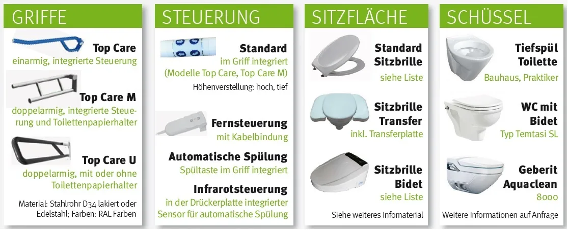 Die Lift Toilette CarePlus kann nach Wunsch konfiguriert werden. Für das Unterputzelement bieten wir verschiedene Griffe, Steuerungsalternativen sowie diverse Sitzflächen oder Toiletten-Schüsseln an.