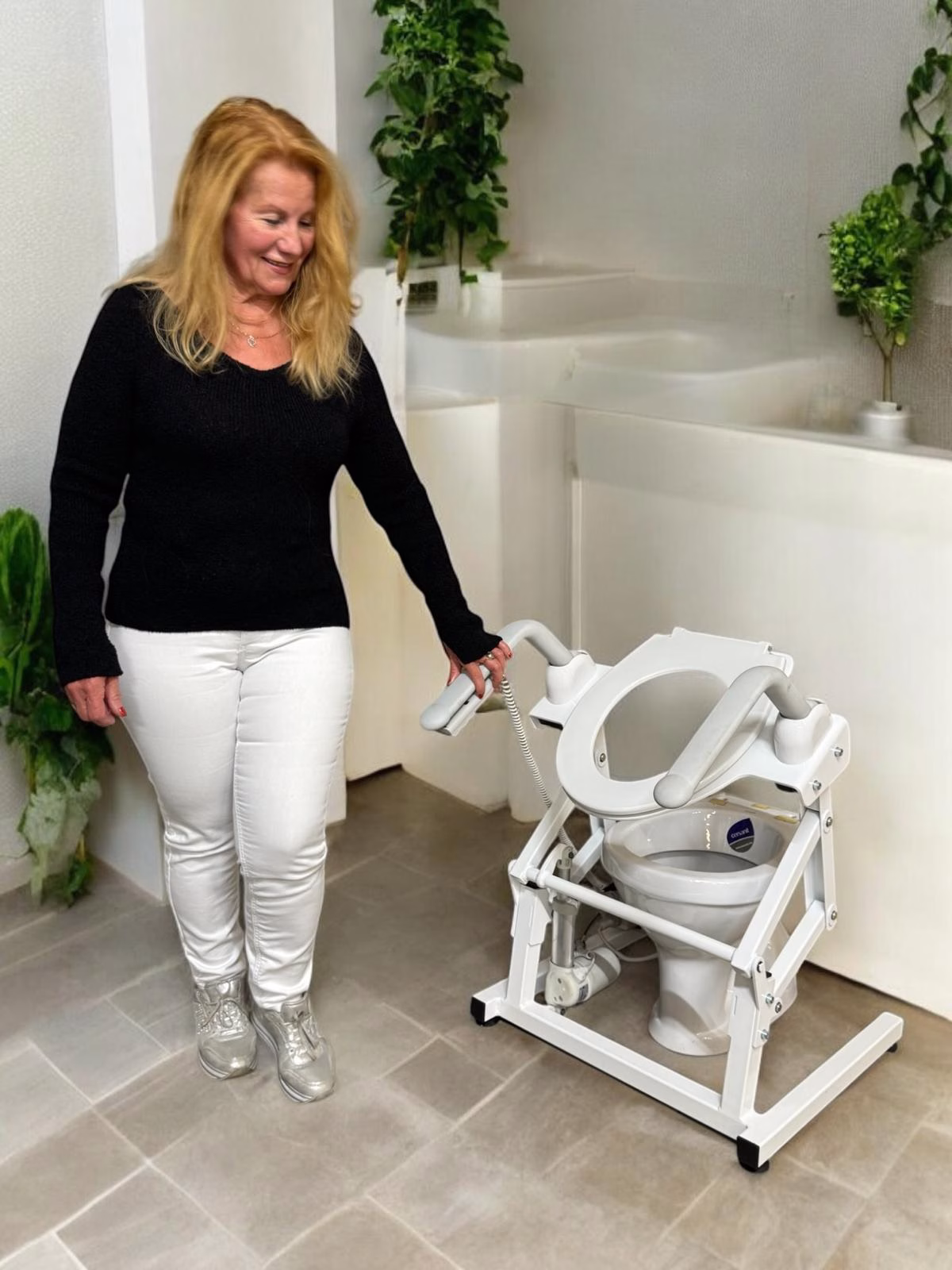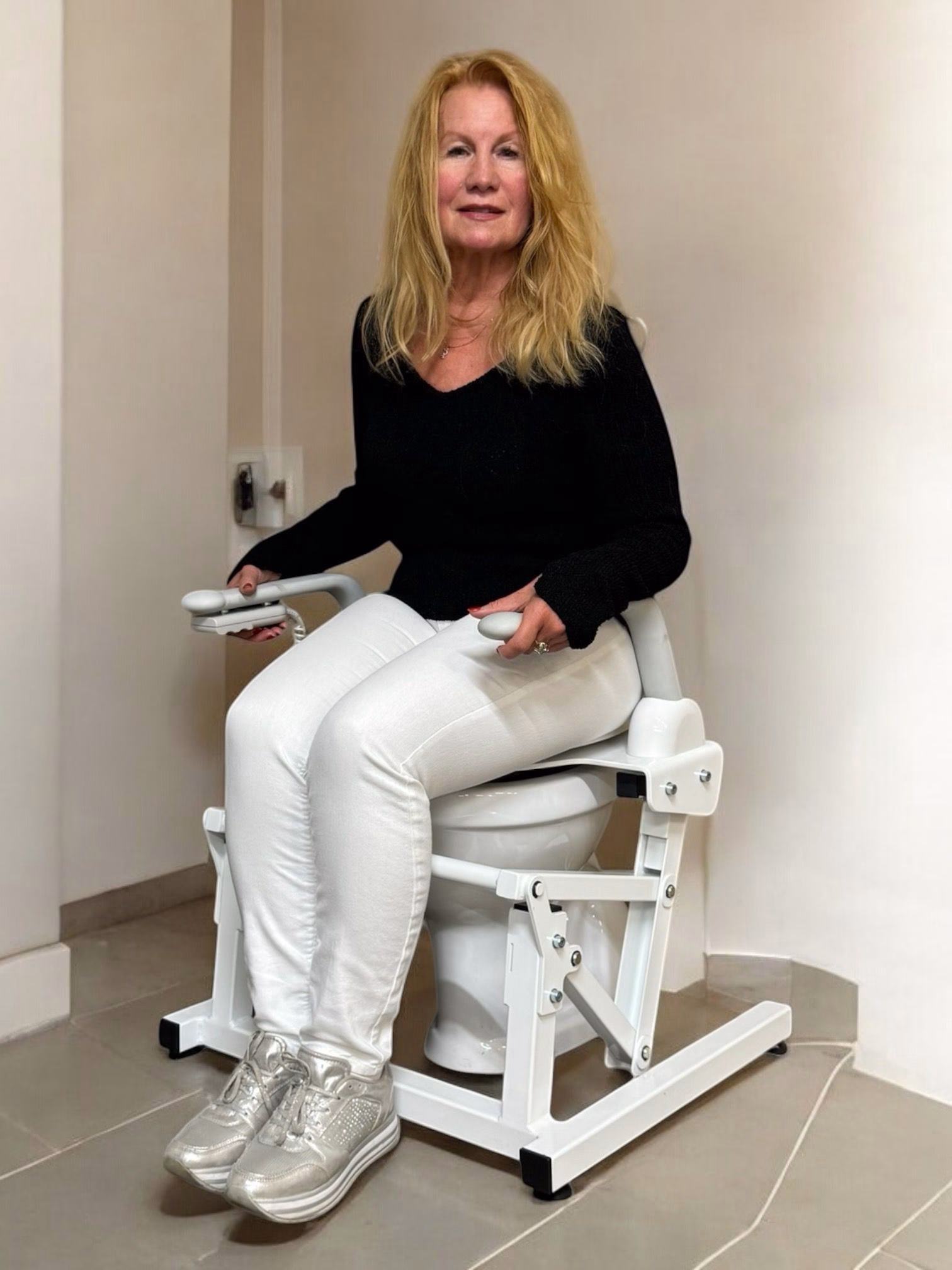 Die BC70 Aufstehhilfe wurde speziell für Menschen mit eingeschränkter Mobilität entwickelt, um den Toilettengang so einfach und komfortabel wie möglich zu gestalten. Dank der elektronischen Hebefunktion unterstützt die BC70 das sichere Hinsetzen und Aufstehen – per Knopfdruck, ganz ohne Kraftaufwand. Die Aufstehhilfe wird ohne feste Montage über das vorhandene WC gestellt und passt auf nahezu jede Toilette.